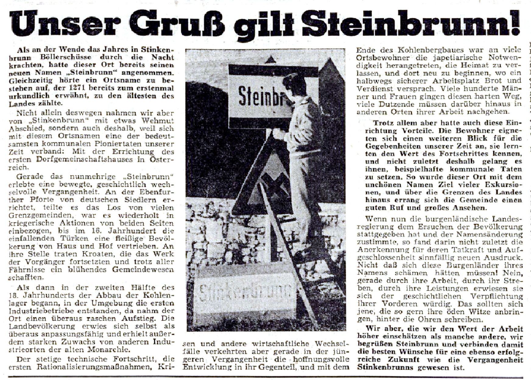 Dieses Foto ist Teil des kollektiven Gedächtnisses der Steinbrunner: Gerhard Frasz montiert zum Jahresbeginn 1959 die neuen Ortstafeln. Stinkenbrunn heißt nun Steinbrunn.
