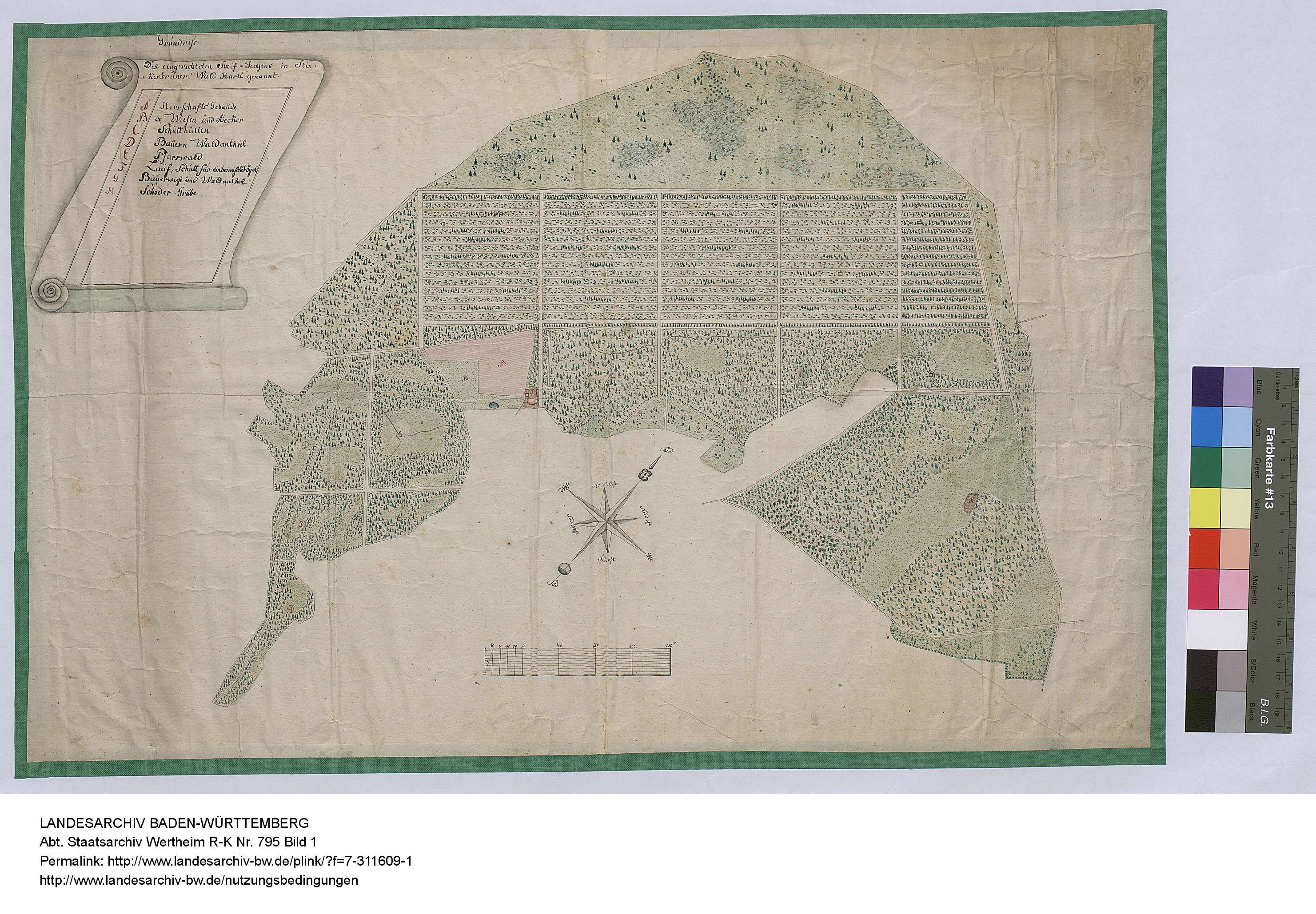 Zur Karte: Die Karte ist eine sogenannte Inselkarte, es ist nur der gewünschte Bereich grafisch dargestellt – wie eine Insel. Es handelt sich um eine handkolorierte Federzeichnung. Der 42 mal 65 cm große Plan ist aus dem Bestand des ehemaligen Staatsarchivs Wertheim und wurde dort fälschlicherweise geographisch „Böhmen“ zugeordnet.