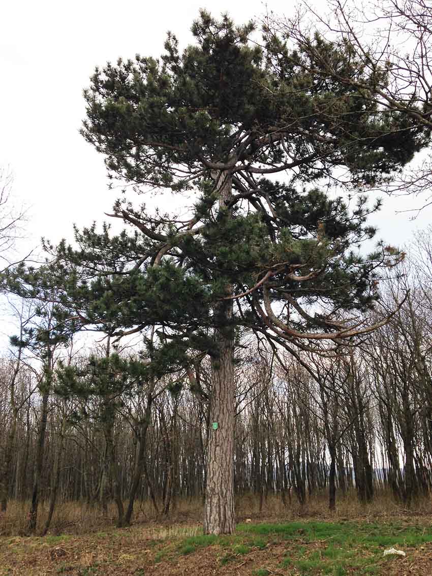 Diese Schwarzföhre (=Scharzkiefer, Pinus nigra) steht auf dem Grundstück Nr.1859 der KG Steinbrunn am südwestlichen Ende des Hartl-Waldes und ist nach der Ausforstung in der Umgebung wieder gut zu sehen.