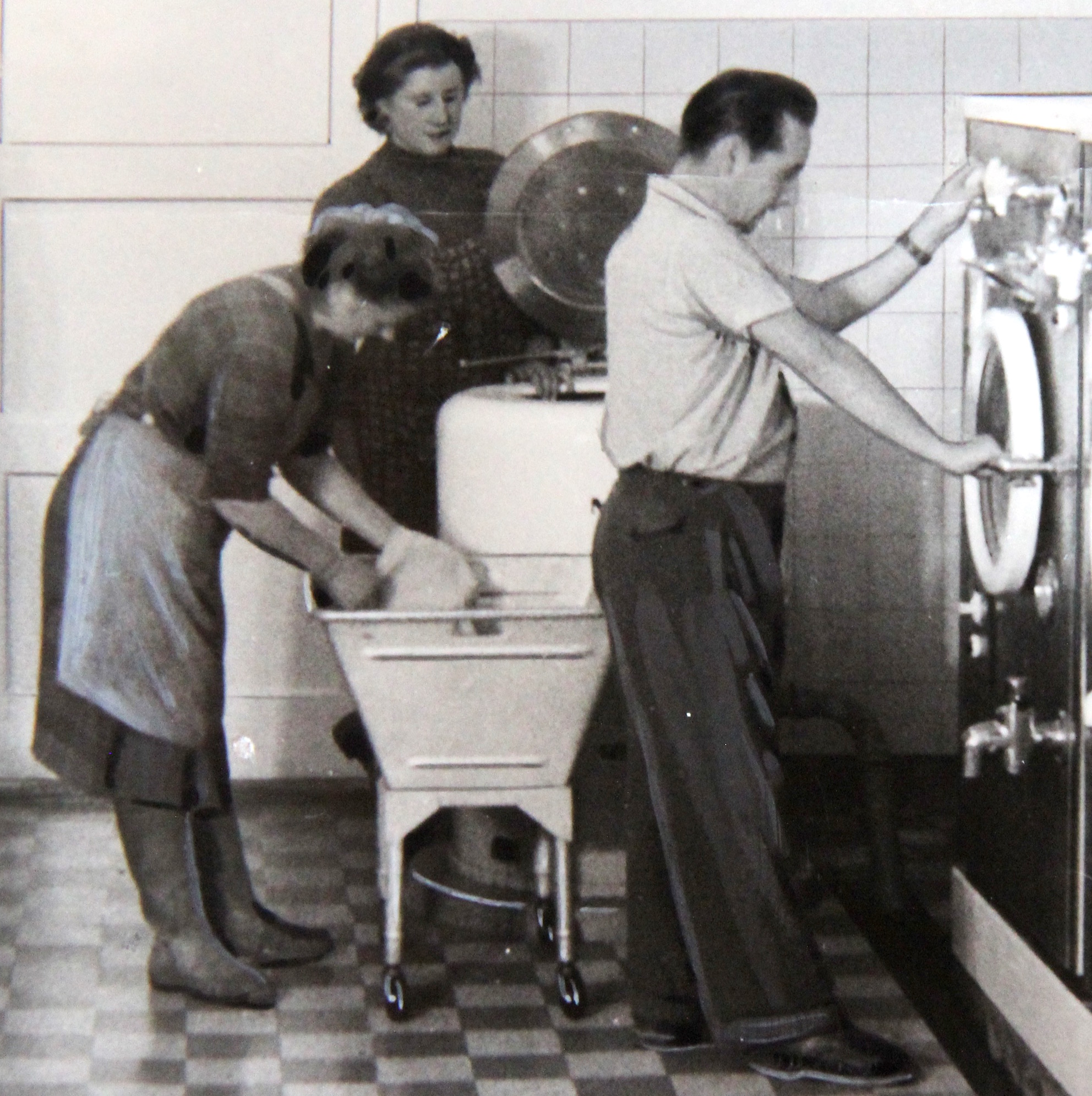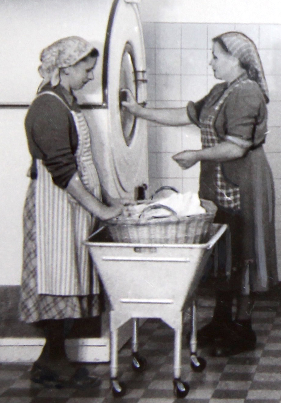 Die Waschküche wirkt blitzblank (spiegelnde Bodenfliesen!) und für die damalige Zeit hochmodern: komplizierte Geräte, Wasseranschlüsse, Stromkabel, die metallenen Wäschewägen, verschiedene Schalter an der Wand, die moderne Lampe an der Decke und die Uhr über der Tür (die Uhrzeit ist nicht erkennbar).