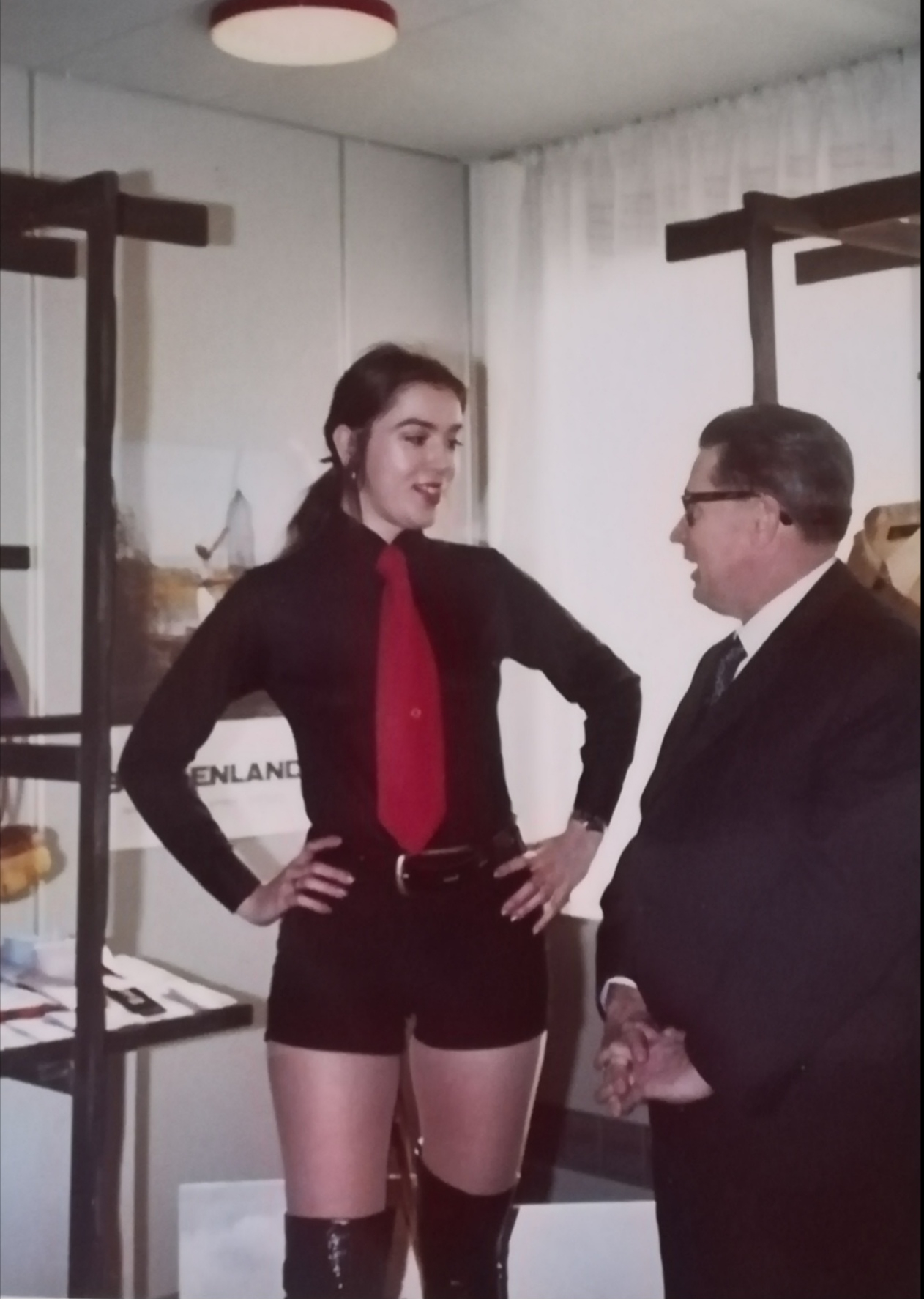Die Dame am Foto fungierte als Hostess und Animation am Messestand und präsentierte gekonnt selbst ein „Exquisit“-Hemd. Auf Einladung der Himico reiste auch Steinbrunns Bürgermeister Fritz Robak zur Ausstellung an. Schließlich war es Robak, der die Himico nach Steinbrunn brachte.