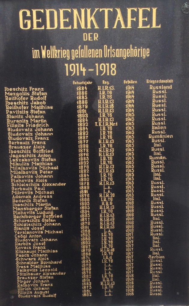 Es gibt weiterer Ungereimtheiten rund um die Gefallenenliste, die sich aber auflösen lassen: Stephan Laszakovits, geboren 1885 in Stinkenbrunn, Kutscher, war seit 1916 im Osten vermisst. Seine Frau Barbara (geb. Gmasich) stellte 1924 bei Gericht einen Antrag auf die Eröffnung eines Verfahrens zur Todeserklärung, der Fall ist in Gerichtsakten dokumentiert. Die Gedenktafel nennt zwar einen Laszakovits Stefan, der allerdings 1887 geboren und 1915 gefallen war. Eine Namensgleichheit bei typischen Steinbrunner Familiennamen (zB nennt den Gedenktafel drei (!) Johann Gludovatz) kam häufig vor. Aber: Beide Ste(ph)fans sind am 8. August geboren. Das wäre nun ein Zufall zu viel. Es handelt sich wohl um dieselbe Person. Es wäre nur zu klären, ob das Geburtsdatum auf der Gedenktafel oder im Gerichtsakt korrekt ist…