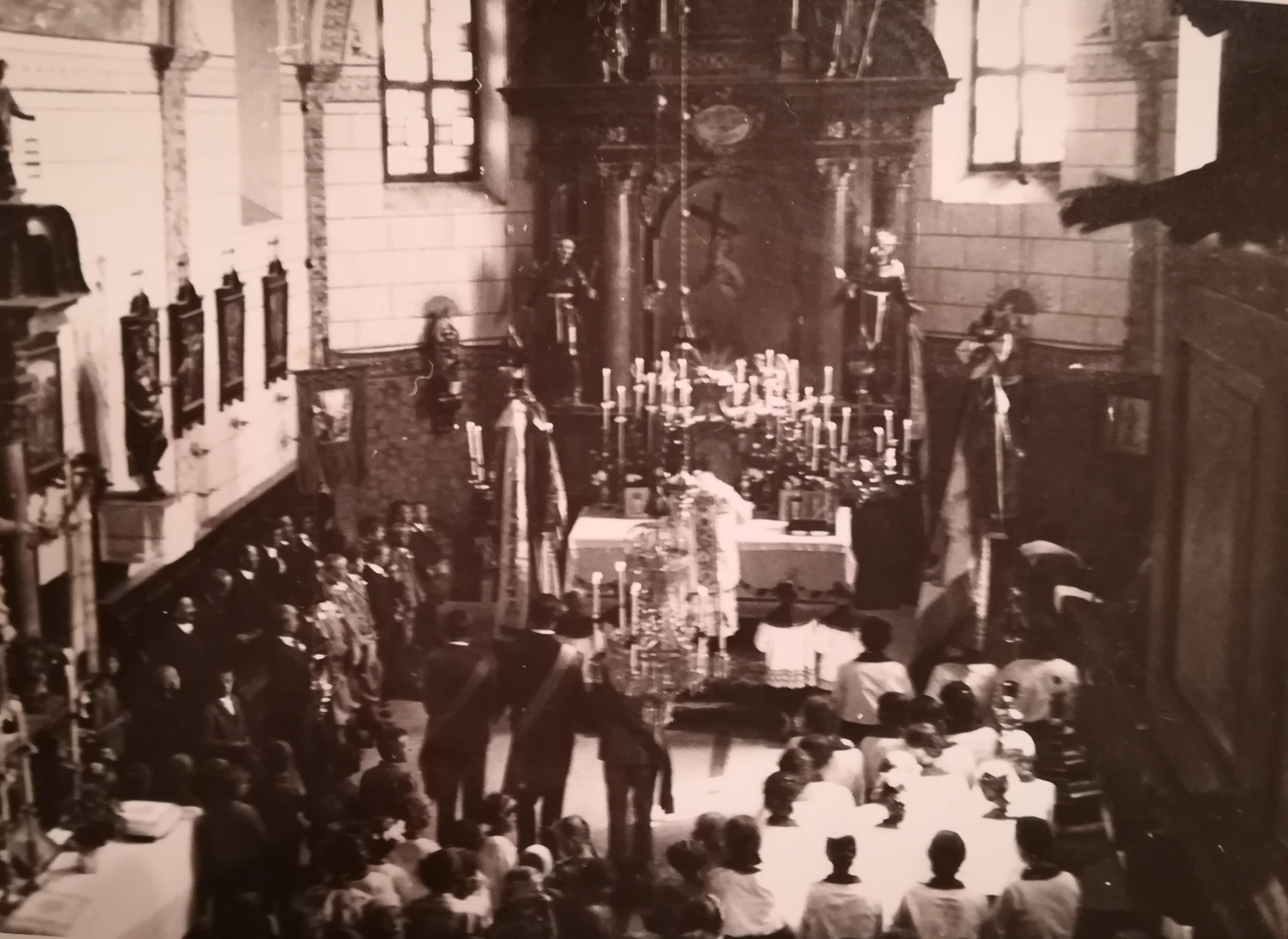 Das Foto gibt hier gibt einen guten Eindruck des Inneren vor der umfassenden Renovierung in den Jahren 1958/59 wider. Deutlich zu erkennen ist die Quadermalerei an den Wänden, die aus dem 19. Jahrhundert stammen könnte. Noch hält der Pfarrer die Messe mit dem Rücken zum Volk direkt am Hochaltar, ein Volksaltar wurde erst in den 1960er Jahren errichtet. Dadurch wirkt der Chorraum der Kirche größer, da die Kirchenbesucher bis in diesen hinein aufgestellt sind. Links ist ein Seitenaltar zu erkennen, der sich zwischen Sakristei-Eingang und Kanzel befand. Hier stand jene alte Madonna, die heute auf der rechten Seite im Chor aufgestellt ist. Die hinteren Wände des Chores sind mit Wandteppichen geschmückt, die seitlichen Wände sind vertäfelt, die auch die gotische Nische an der linken Wand verdecken.